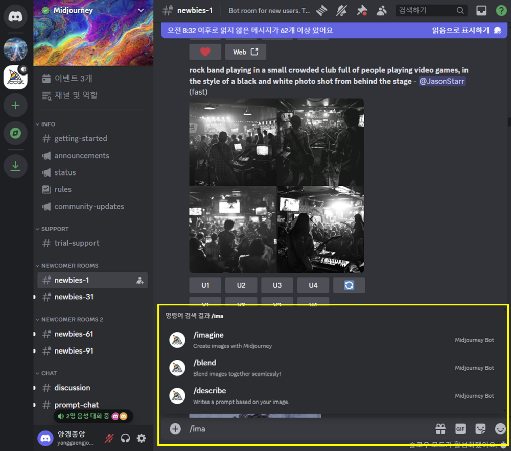 이미지를 생성하기 위해 "NEWCOMER ROOMS" 의 하단에 있는 "newbies"로 시작하는 채팅방을 들어간다.
