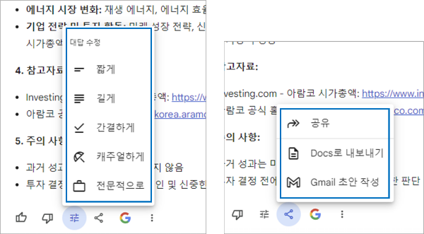 답안 하단의 아이콘을 누르면 대답에 대한 수준을 설정하거나, 답안을 구글Docs나 Gmail로 발송 할 수 있다.