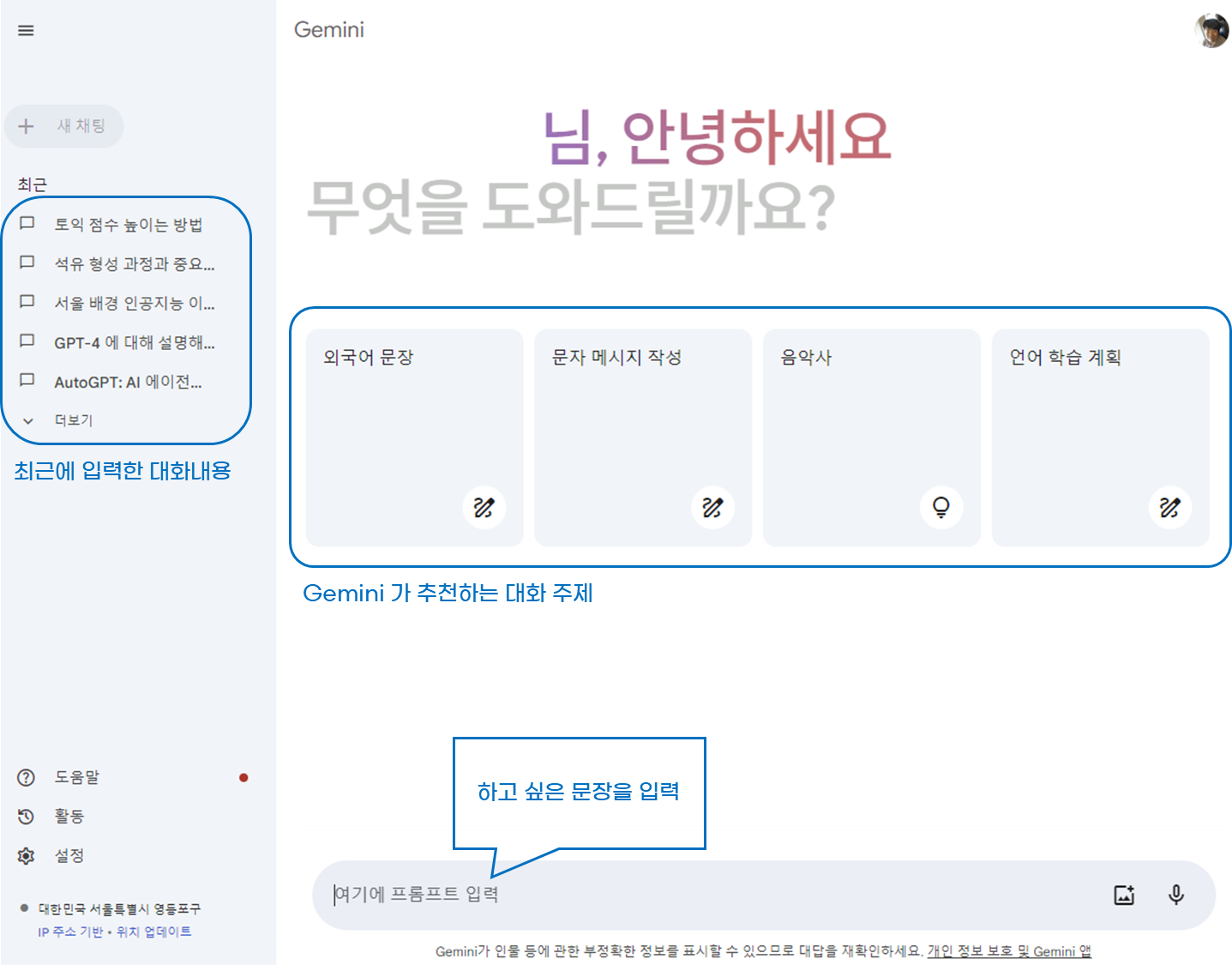 웹 브라우저에서 https://gemini.google.com/ 을 입력하면 아래와 같이 Gemini 화면이 나타난다.