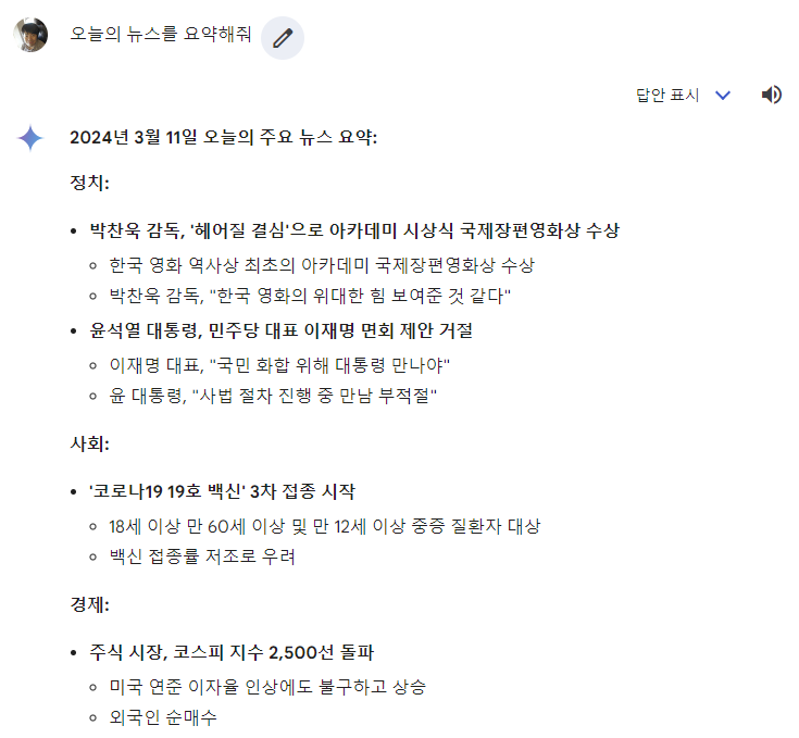 오늘의 뉴스를 알려달라고 입력했을 때 아래와 같은 답안을 제공한다.