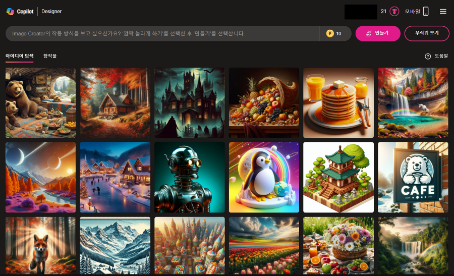 Image Creator는 DALL·E 3을(를) 사용하여 사용자가 AI 이미지를 생성할 수 있도록 도와주는 제품입니다. 텍스트 프롬프트가 제공되면 AI는 해당 프롬프트와 일치하는 이미지 집합을 생성합니다.